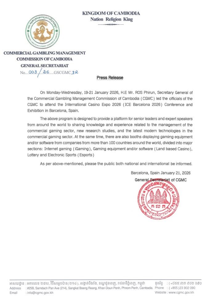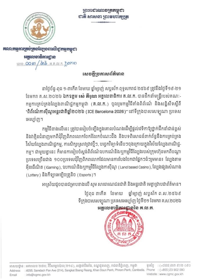 ឯកឧត្តម រស់ ភីរុណ អគ្គលេខាធិការ គ.ល.ក. បានដឹកនាំមន្រ្តីរបស់ គណៈកម្មការគ្រប់គ្រងល្បែងពាណិជ្ជកម្មកម្ពុជា (គ.ល.ក.) ចូលរួមកម្មវិធីពិព័រណ៌ និងសន្និសីទស្តីពី "ពិព័រណ៌កាស៊ីណូអន្តរជាតិឆ្នាំ២០២៦(ICE Barcelona 2026)"នាថ្ងៃចន្ទ-ពុធ ១-៣កើត ខែមាឃ ឆ្នាំម្សាញ់ សប្តស័ក ព.ស.២៥៦៩ ត្រូវនឹងថ្ងៃទី១៩-២១ ខែមករា គ.ស.២០២៦ ឯកឧត្តម រស់ ភីរុណ អគ្គលេខាធិការ គ.ល.ក. បានដឹកនាំមន្រ្តីរបស់ គណៈកម្មការគ្រប់គ្រងល្បែងពាណិជ្ជកម្មកម្ពុជា (គ.ល.ក.) ចូលរួមកម្មវិធីពិព័រណ៌ និងសន្និសីទស្តីពី "ពិព័រណ៌កាស៊ីណូអន្តរជាតិឆ្នាំ២០២៦(ICE Barcelona 2026)" នៅទីក្រុងបាសសេឡូណា ប្រទេសអេស្ប៉ាញ។